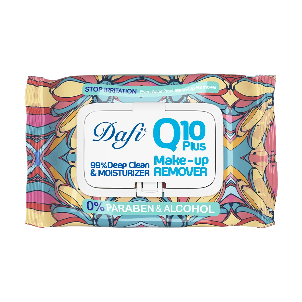- پاکسازی صورت: یک دستمال مرطوب پاککننده آرایش Q10 دافی را از بستهبندی خارج کرده و به صورت ملایم روی پوست صورت، دور چشم و… بکشید تا زمانی که آرایش و آلودگیها کامل پاک شوند.